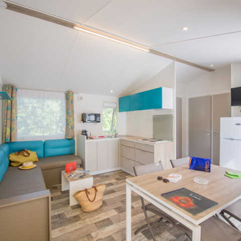 - Mobilheim Privilège mieten In dieser Reihe gibt es unter anderem ein Modell mit zwei Schlafzimmern und Platz für vier Personen – das Schlafsofa im Wohnzimmer ermöglicht es, zwei weitere Personen unterzubringen. Das erste Schlafzimmer dieses 28 m² großen Mobilheims verfügt über ein Doppelbett, und im zweiten Schlafzimmer gibt es zwei Einzelbetten. Neben dem Schlafsofa umfasst das Wohnzimmer eine Küchenzeile mit allem notwendigen Zubehör. Die Giebelterrasse ist der perfekte Ort, um sich zu entspannen und die Aussicht nach einem aktiven Tag zu genießen. Die Gartenlounge und Liegestühle tragen ebenfalls zum Komfort und Wohlbefinden der Camper bei.